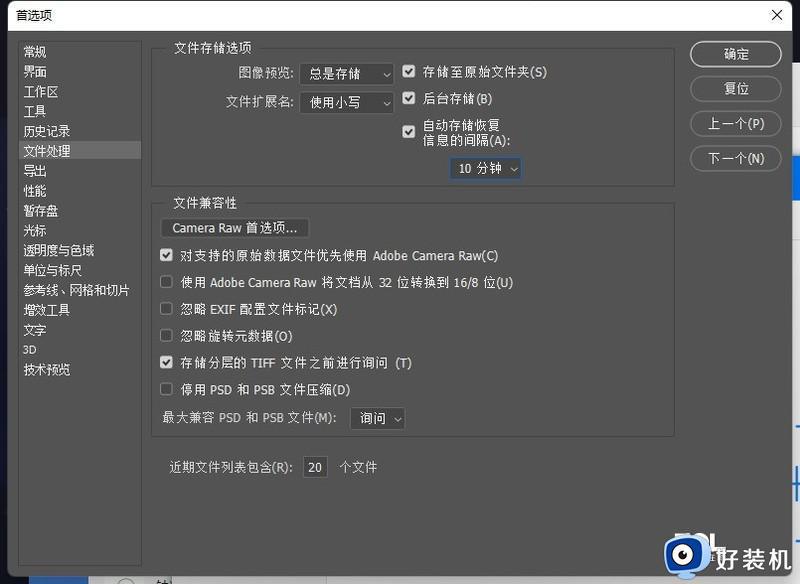 常用办公软件的设置一定要修改信息存储的间隔。以PS为例,按Ctrl+k进入首选项,找到文件处理即可设置自动存储恢复信息的间隔。不得已的情况下,也可以采用下面的办法尝试补救。